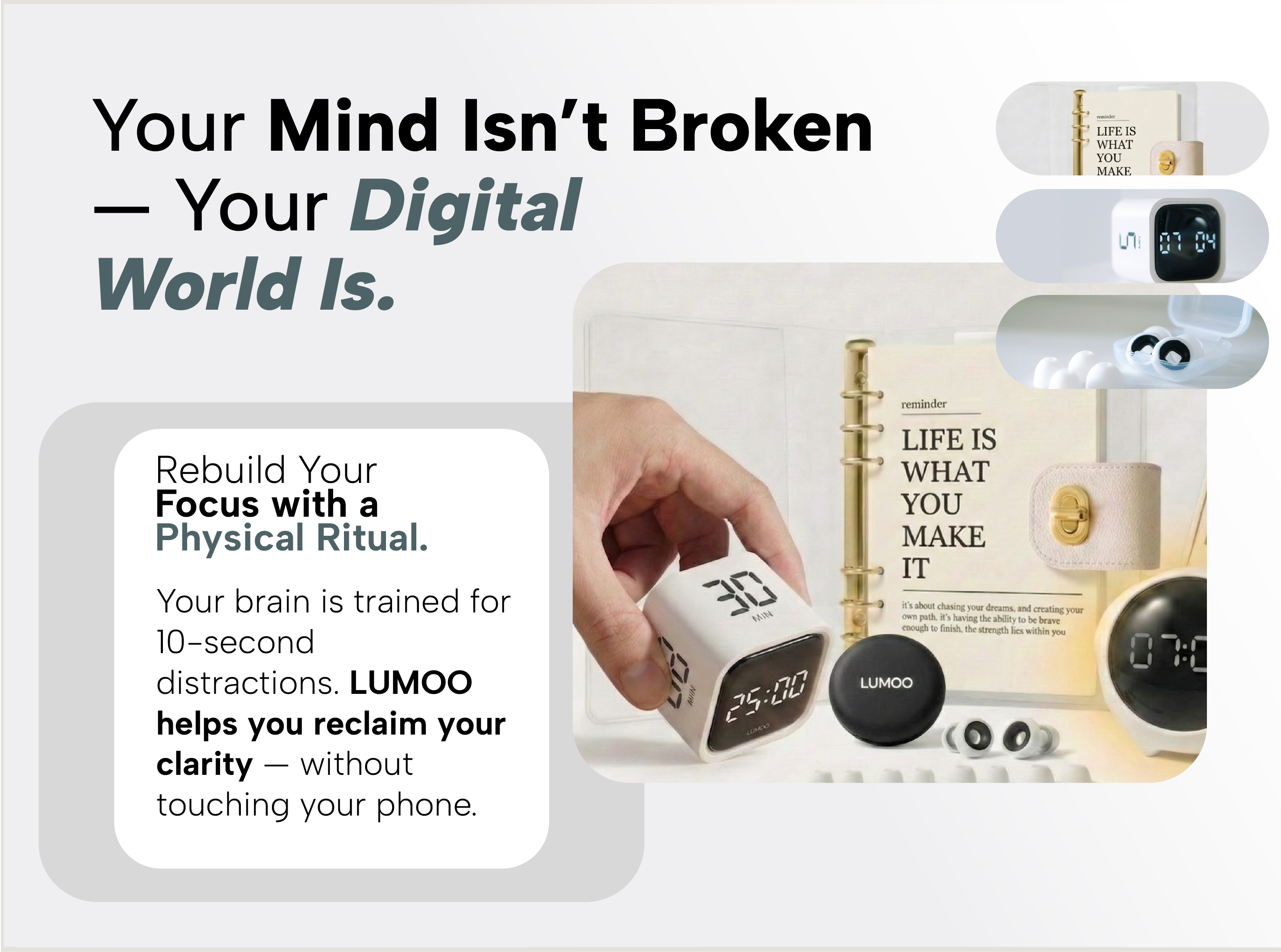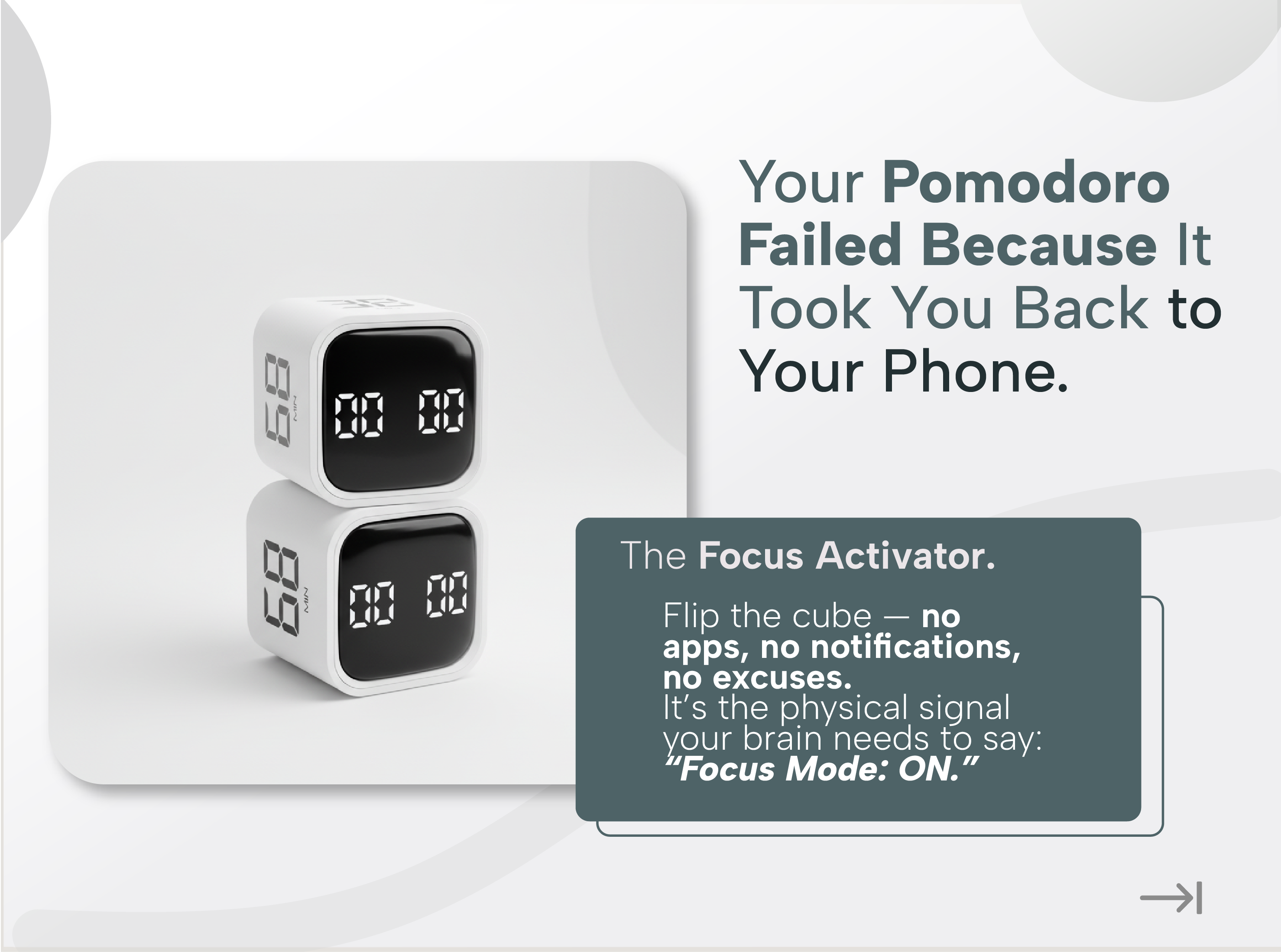 Because your phone is a trap. The moment you unlock it to set a timer, you risk seeing a notification and losing 20 minutes to scrolling. The Focus Anchor protects your attention by keeping your phone out of sight and out of mind.