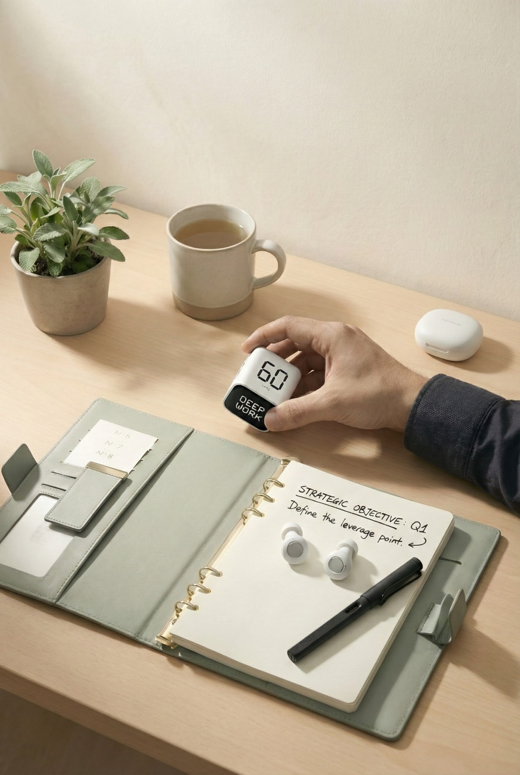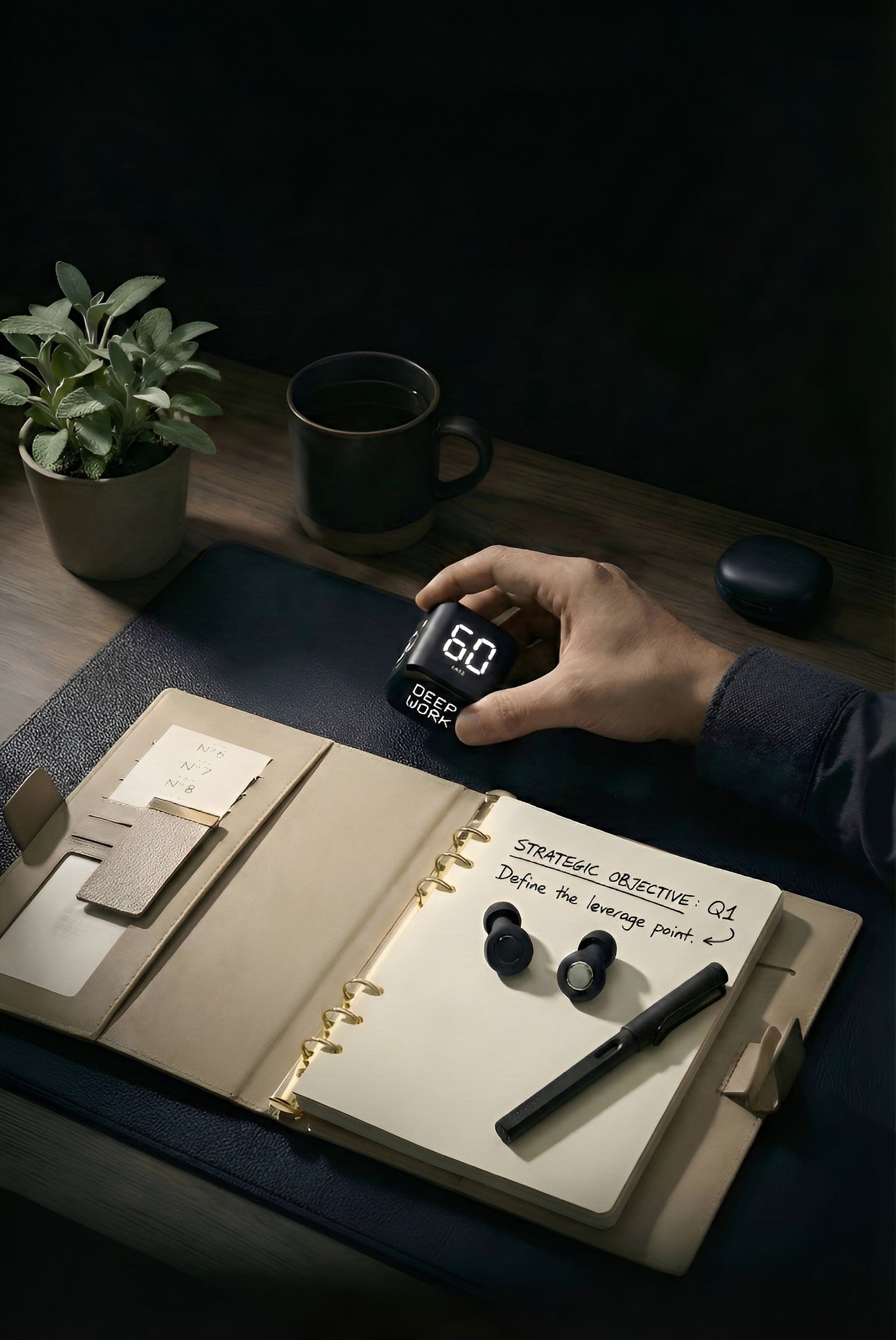 Planning on paper is step one. To reach deep flow, you need the full triad: Space (Binder) + Time (Cube) + Silence (Plugs).