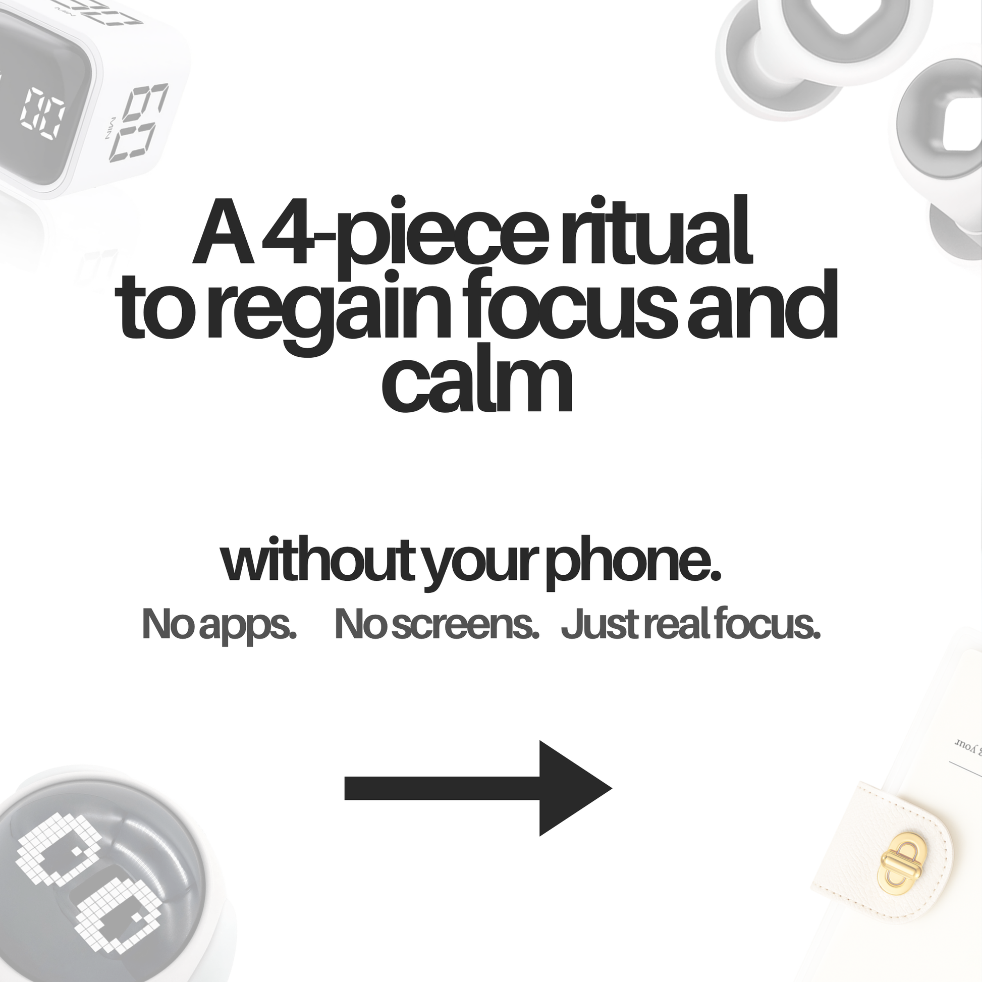 Each element of the kit (timer, notebook, earplugs, and wake-up clock) is designed to work together, creating a consistent offline habit that lasts.